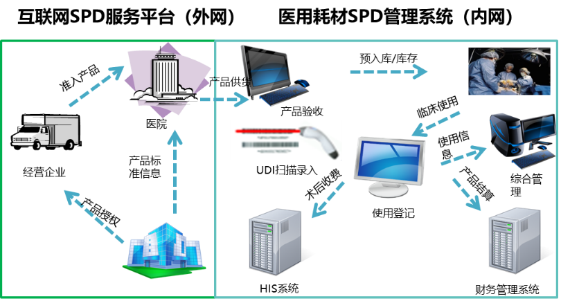 在院内出入库环节“有码尽扫,扫码必校”,通过扫码时校验DI确保入院产品的来源可靠,扫码记录PI信息,在SPD系统中记录完整的UDI信息和院内诊疗HIS系统交互,在患者使用耗材进行HIS计费时,每一个耗材UDI和患者关联,真正实现了基于UDI的全程可追溯。